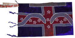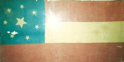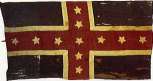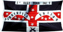 The exact date of this flag's arrival to the regiment is unknown. It is possible this was the original Polk Corps flag they received upon becoming attached before Shiloh, and then altered after the battle of Perryville later that year. The flag is made of wool bunting and the two white "waves" carried the honors Shiloh and Perryville. On the red cross in the bottom center contained a set of crossed cannons. It was painted on a white block and sewn to the flag. A star is believed to be missing on the extreme right side of the flag above the wave. The white banner across the top containing the regimental name measures 3". The lettering on the banner was painted on black with a goldish outline around the lettering. It was attached to the pole using four tie strings. The dimensions of the flag are 28" x 46". A streamer is attached to the flag with "FIRST TENNESSEE REGIMENT INFT" painted on with red lettering. The bottom picture shows what it most likely looked like during its use. This flag is currently at the Tennessee State Museum. It was retired in early 1864 because of General Johnston's order to revert the army to the St. Andrews Cross pattern. |