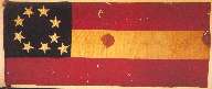 "Confederate Flag; blue field in upper staff corner with 9 large white stars, 8 in a circle and 1 outside the circle; faded red stripes at top and bottom with white stripe between lower red stripe made in two pieces; two large bloodstains, one at center, one at outer edge; several smaller bloodstains; numerous bullet & moth holes overall; starred edge of flag has rope with tassels and red & blue ribbons at each end. It was captured by Capt. Chauncey of the 13th Indiana Infantry and donated to the state of Tennessee by Chauncey's granddaughter, Mrs. Franklin C. Goode, from Chattanooga, TN on March 13, 1982.