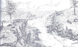 This flag was carried for the rest of the war. Carrying the honors of Murfreesboro, Perryville, and Shiloh. Still retaining the cross cannons at the bottom. The only image of the flag available is from a sketch of the regiment fighting at Kennesaw Mountain drawn by a participant. When the regiment surrendered at Greensboro, NC it also surrendered this flag. It was described as: "so bullet riddled and torn that it was but a few blue and red shreds." Its whereabouts now are unknown. Having been through the Atlanta Campaign, 1864 Tennessee Campaign, and N.C. Campaign. There probably was not much to save. |
